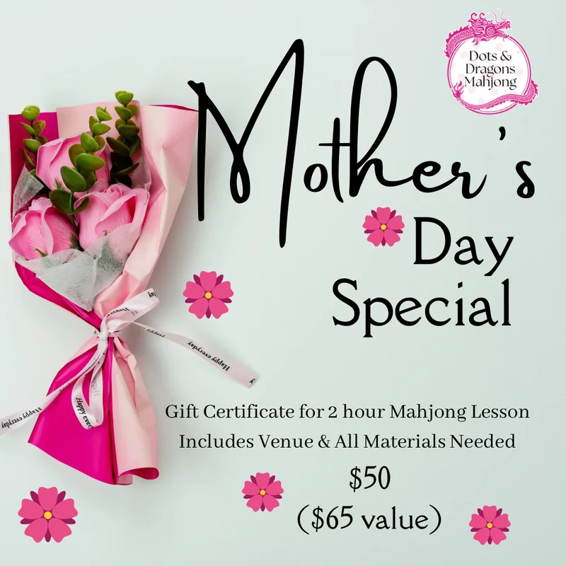 Give mom what she really wants… a Mahjong lesson at special Mother's Day pricing. Includes venue, all items needed to learn American Mahjong in a 2 hour lesson. A printable gift certificate will be provided with a code she can redeem on this site when booking lesson. Must be used within 90 days. Nonrefundable. More class options will be added for May & June.